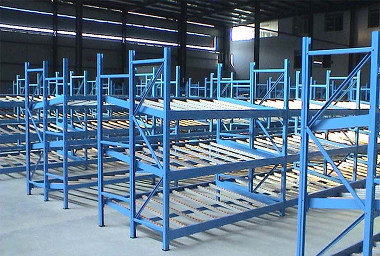 流利式货架又称滑移式货架,采用辊轮铝合金、钣金等流利条,利用货物台架的自重,从一边通道存货,另一边通道取货实现先进先出,存储方便,以及一次补货多次取货。流利式货架的流利条直接连接到前后横梁及中间支撑梁上,横梁直接挂在支柱上,流利条安装倾斜度取决于货箱的尺寸、重量以及流利架的深度,通常取5%~9%。当滚道较长时,可用分隔板将滚道隔开。取货端需安装制动片使货物减速,降低冲击。流利架存储效率高,适合大量货物的短期存放和拣选。可配电子标签,实现货物的轻松管理,常用滑动容器有周转箱,零件盒及纸箱,适合大量货物和短期存放和拣选。